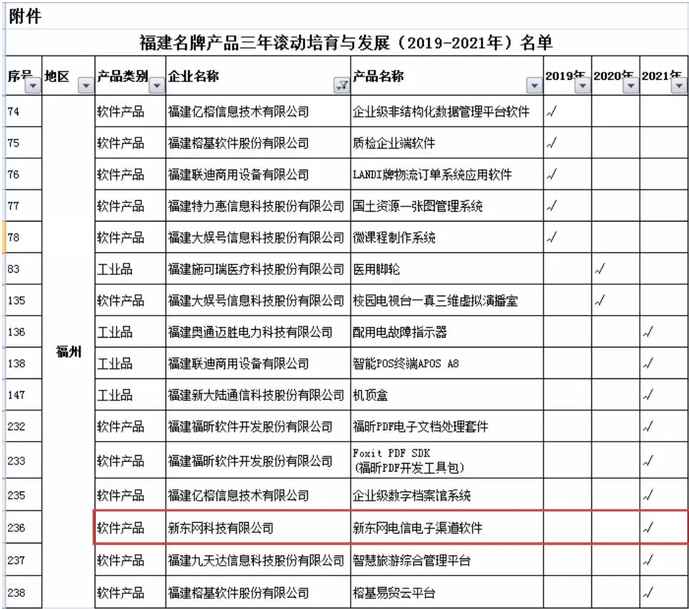 其中,福州軟件園11家企業(yè)的產(chǎn)品入選名單,新東網(wǎng)科技“電信電子渠道軟件”名列其中。