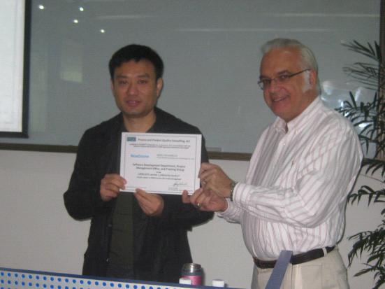 12月14日上午主任評估師在最終發(fā)現(xiàn)結(jié)果的陳述會上,向我司提交了正式的評估結(jié)果報告(Final Findings),并在現(xiàn)場會上將CMMI5的認(rèn)證證書授予了陳融圣總經(jīng)理。